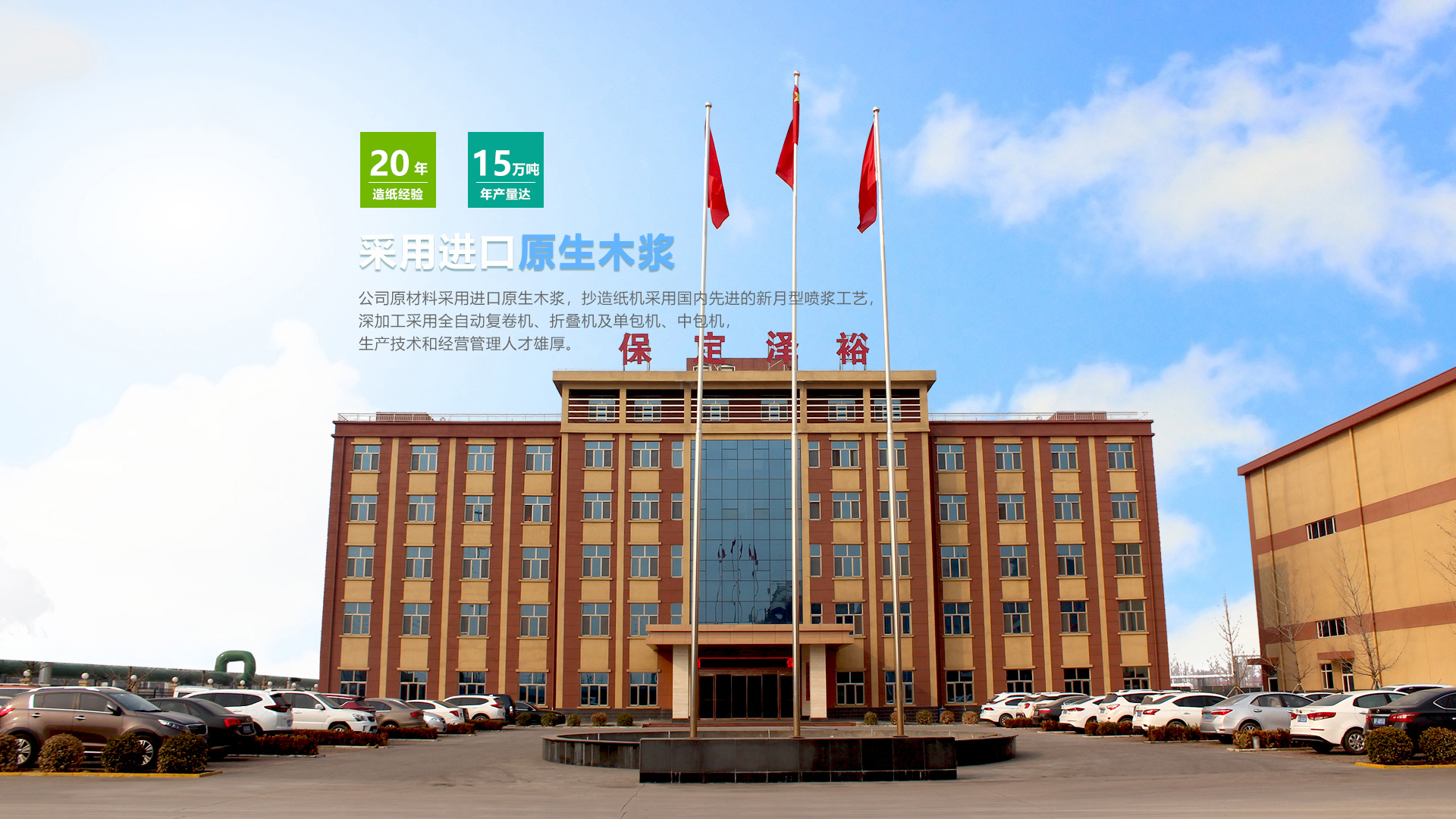 保定澤裕新型材料有限公司坐落于素有北京南大門(mén)之稱(chēng)的河北省文化古城保定市,位于順平縣經(jīng)濟(jì)開(kāi)發(fā)區(qū)北園,緊鄰“華北生活用紙產(chǎn)業(yè)基地“保定市滿(mǎn)城區(qū),地理位置優(yōu)越,現(xiàn)代信息通暢。公司生產(chǎn)銷(xiāo)售衛(wèi)生紙、面巾紙、手帕紙、餐巾紙等系列生活用紙,產(chǎn)品具有潔白柔和、細(xì)膩衛(wèi)生、超倍柔韌、吸收性強(qiáng)、容易降解等特點(diǎn),是集產(chǎn)品研發(fā)、生產(chǎn)、銷(xiāo)售為一體的大型公司。公司原材料采用進(jìn)口原生木漿,抄造紙機(jī)采用國(guó)內(nèi)先進(jìn)的新月型噴漿工藝,深加工采用全自動(dòng)復(fù)卷機(jī)、折疊機(jī)及單包機(jī)、中包機(jī),生產(chǎn)技術(shù)和經(jīng)營(yíng)管理人才雄厚。